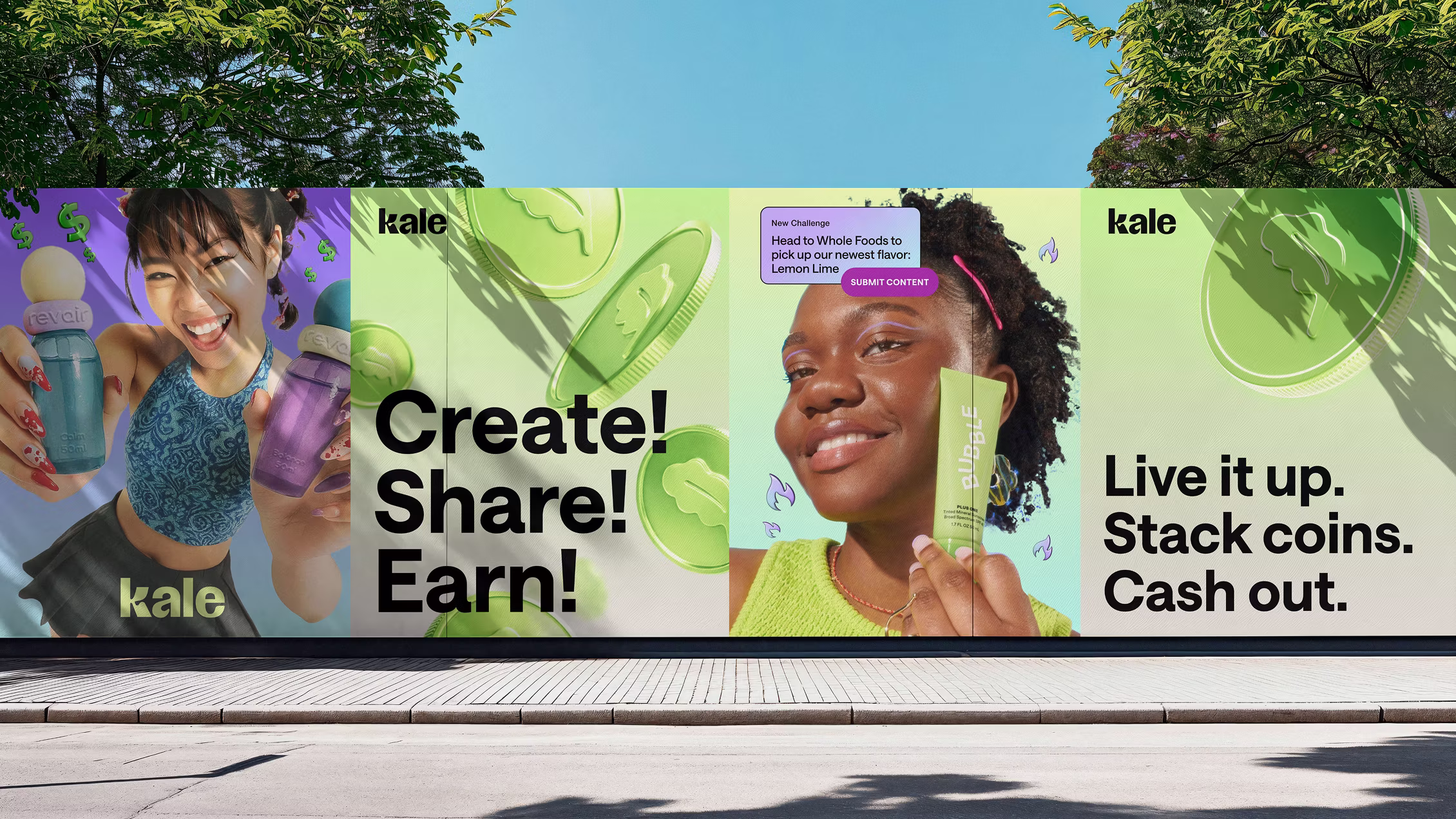 We built a joyful digital world where brands revolve around the user. Game-inspired elements—Kale coins, power-up arrows, and achievement trophies—highlight the many ways fans can play and win through daily challenges. A palette of greens and gradients connects the modern arcade aesthetic to Kale’s name, while playful digital frames echo the Kale leaf and showcase relatable moments of fans enjoying the app in real life.