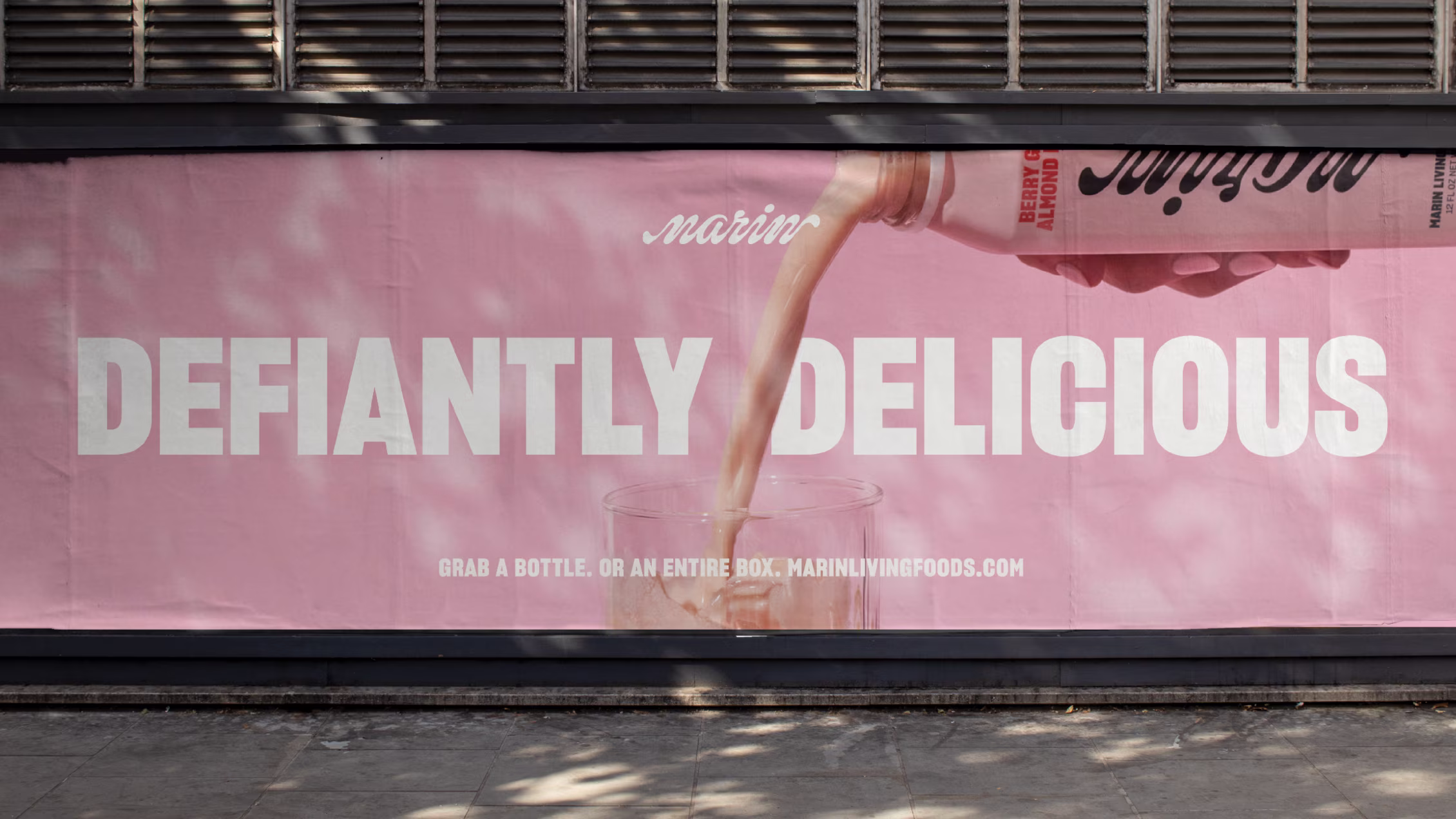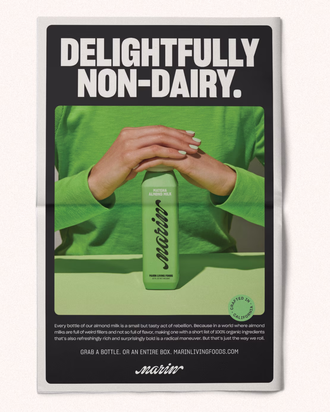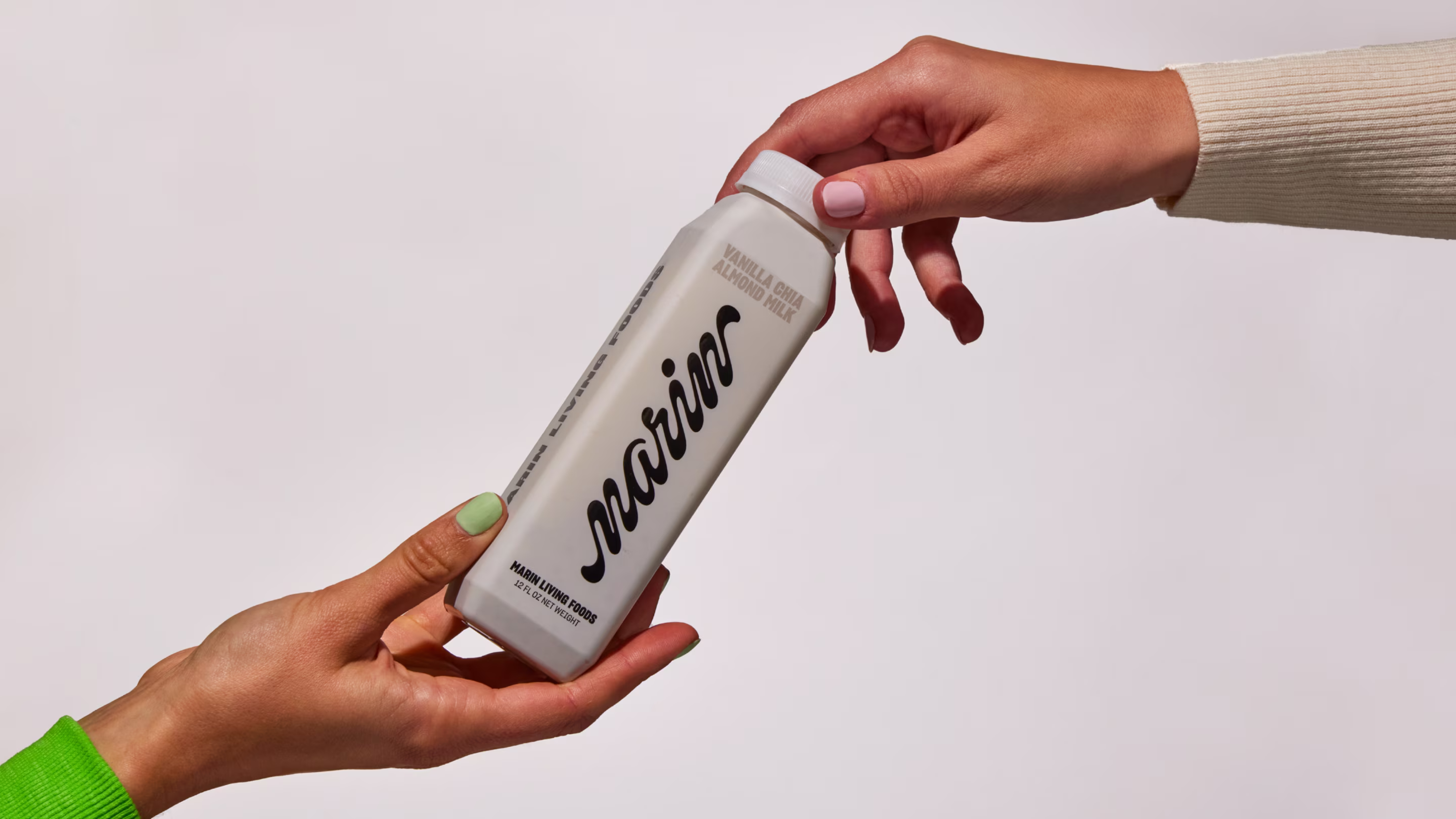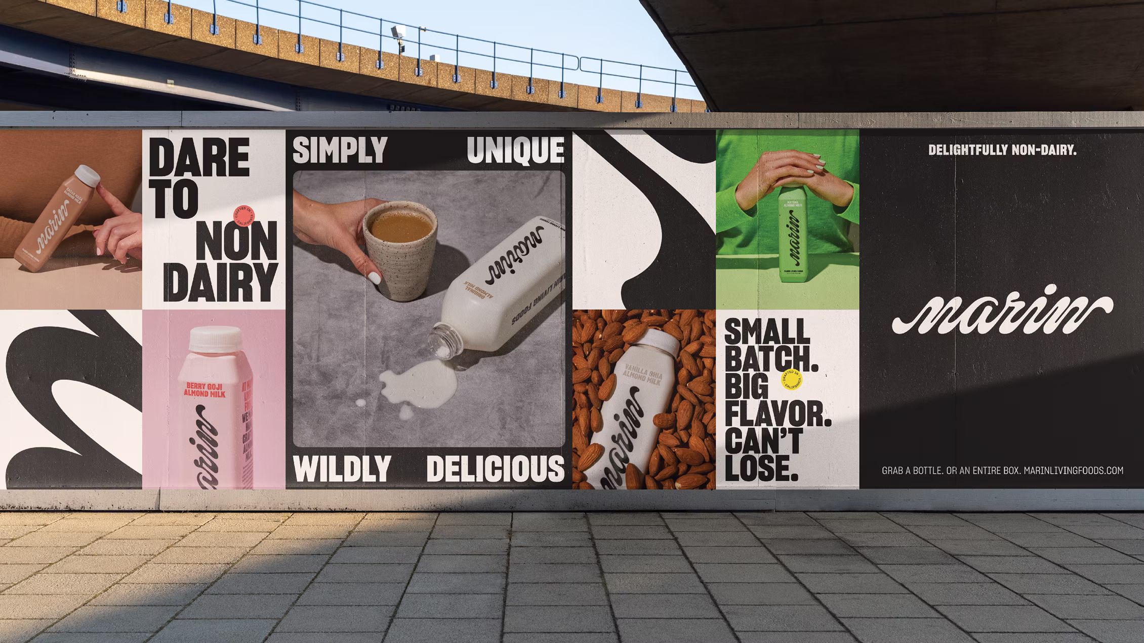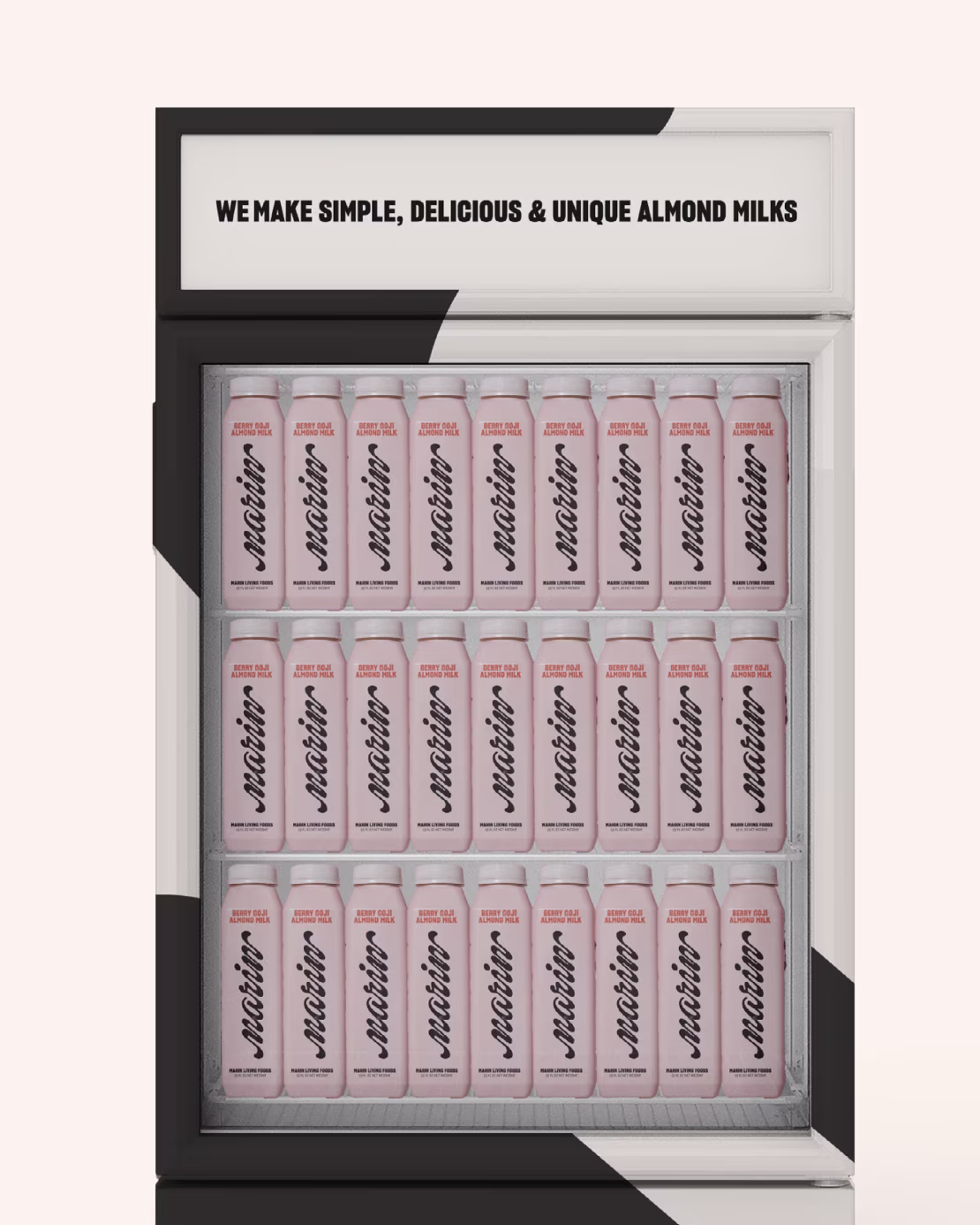 We created the Marin Living Foods identity to be bold, confident and unapologetic. Visually, the juxtaposition between the system’s black-and-white color palette and vibrant ingredient color ways creates moments of surprise and awe. The custom wordmark takes inspiration from creamy textures of nut milks while the patterns we create from the type emphasizes the intentionality behind the Marin Living Foods brand ethos.